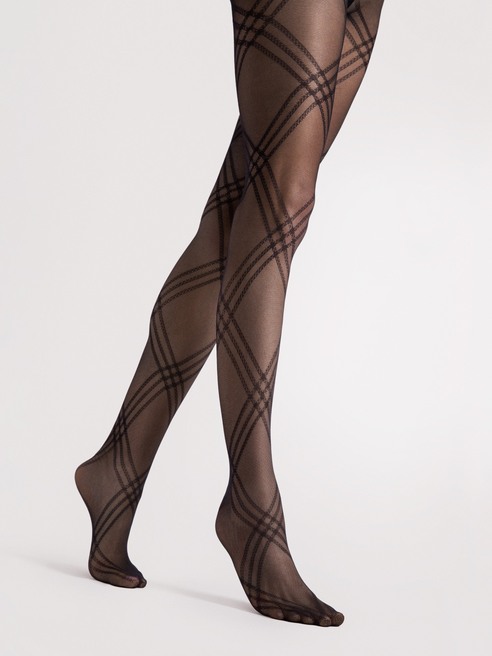 Das Modell Tess ist nicht nur eine Strumpfhose, es ist ein modisches Statement. Inspiriert von den großen Laufstegen der Welt, bringt Tess das klassische Karo-Muster (Check Pattern) in einer raffinierten, transparenten Version zurück. Es ist subtil genug für den Alltag, aber auffällig genug, um jedem Outfit das gewisse "Etwas" zu verleihen.