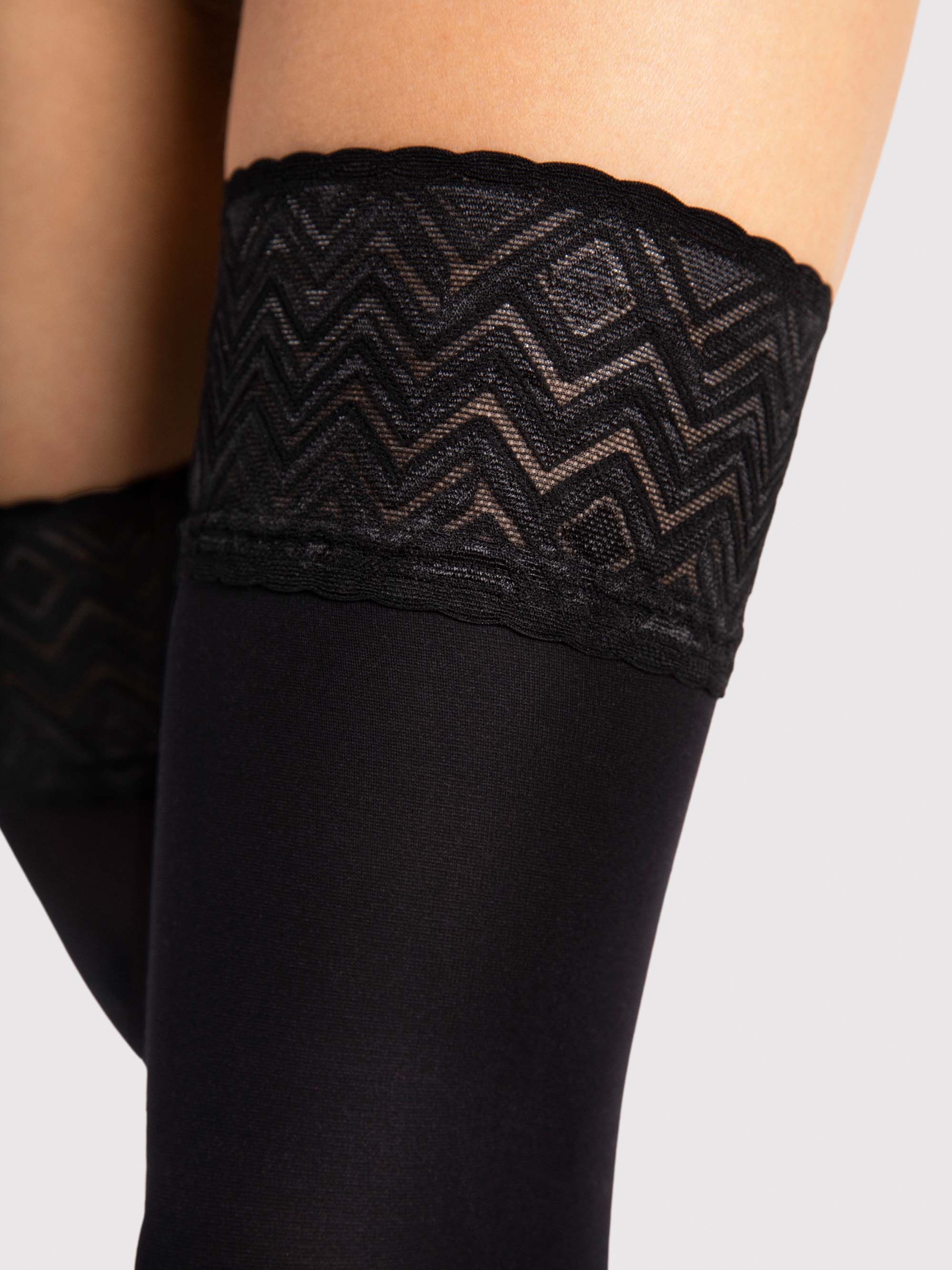 Du liebst eine ebenmäßige Silhouette mit ruhigem, eleganten Ausdruck? Diese halterlosen Strümpfe hüllen deine Beine in eine semi‑matte, blickdichte Optik. Der breite Spitzenbund mit feinem Chevron‑Muster setzt einen stilvollen Akzent und schmeichelt deiner Linie – romantisch und klar zugleich. Das Mikrofasergarn liegt weich an, wärmt dezent und bleibt angenehm atmungsaktiv.